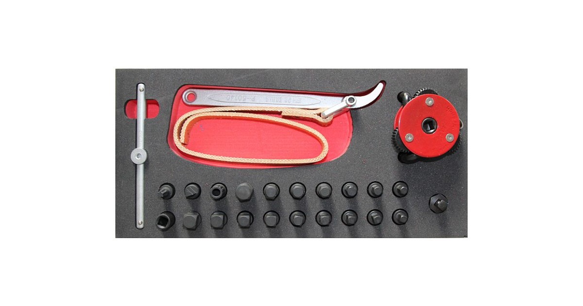 1/3 moodul. Süvendipõhjad punast värvi. et oleks puuduv tööriist kergelt märgatav. Pestav ja puhastatav. Õlivahetuse töödeks.Komplekt sisaldab:Rihmaga õlifiltri võti 30-160 mm3-käpaga õlifiltri võti 65-120 mm. 3/8" keeramisadapteriga3/8" nelikant korgivõti 8-11-12-13-14 mm3/8" nelikant tollmõõdus ko...