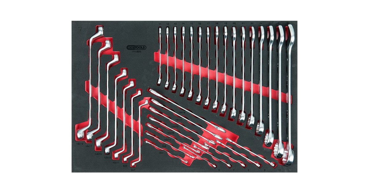 1/1 moodul. 3-värviline. tööriista juures mõõt. Süvendipõhjad punast värvi. et oleks puuduv tööriist kergelt märgatav. Pestav ja puhastatav. Sobib 565x395 mm sahtlisse. Komplekt sisaldab:Silmus-lehtvõti 6-7-8-9-10-11-12-13-14-15-16-17-18-19-21-22-24-27-30-32 mmLeht-lehtvõti 6x7-8x9-10x11-12x13-14x15...