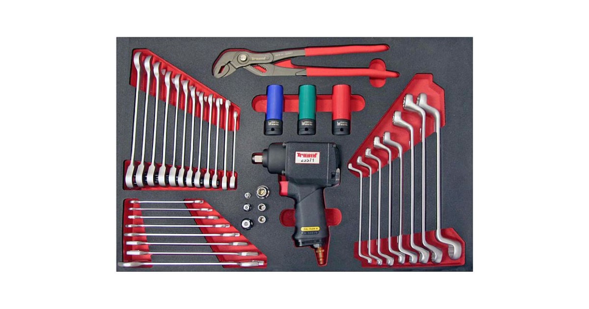 Võtmed ja suruõhu mutrikeeraja. Pehme “foam” alus. mille sisselõike osa on teist värvi pesa paremaks visualiseerimiseks. Õli- ja keemiakindel. pestav. Sobib sahtlitesse 585x410 mm. Mooduli mõõdud 585x405 mm.