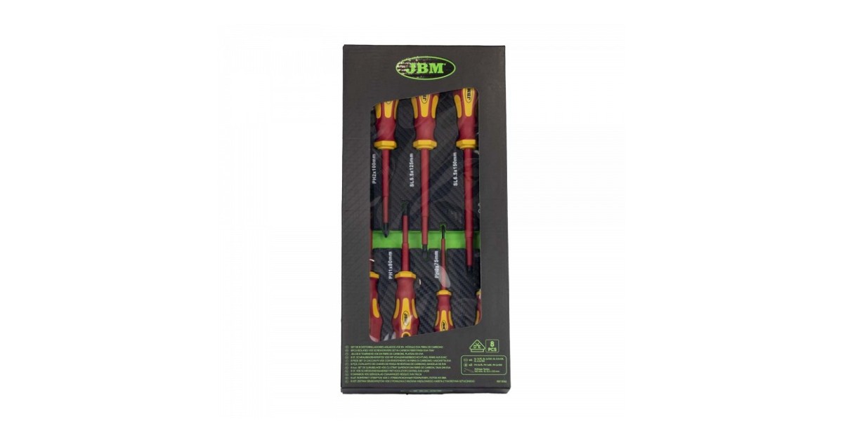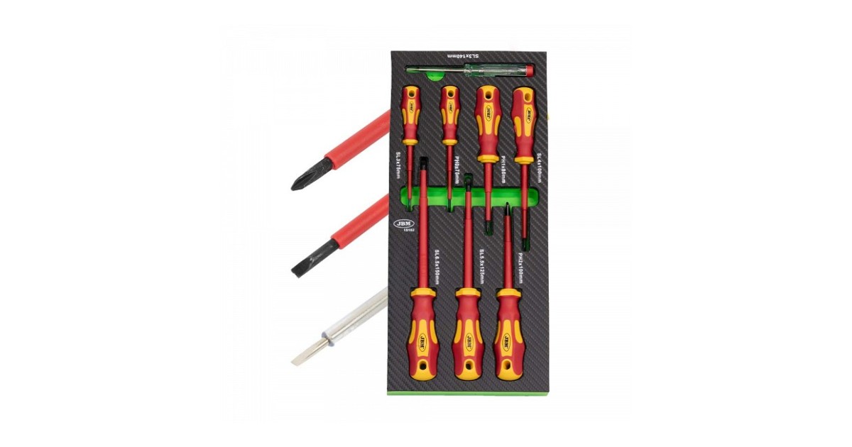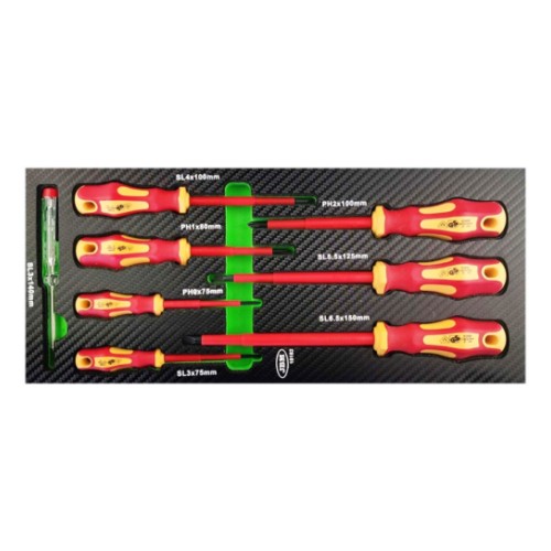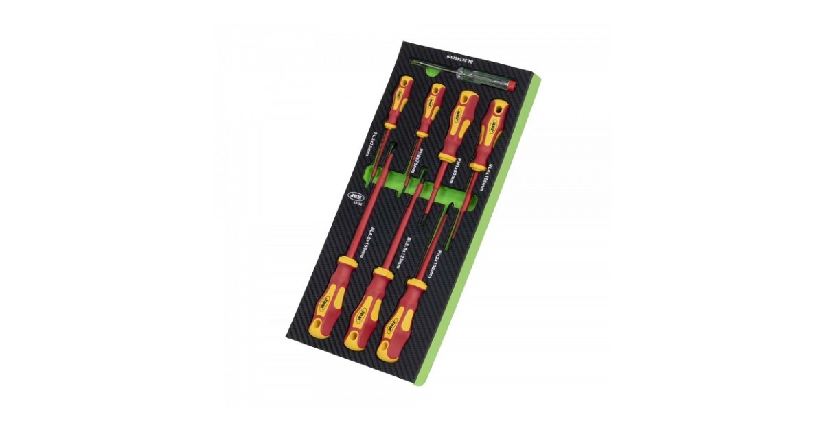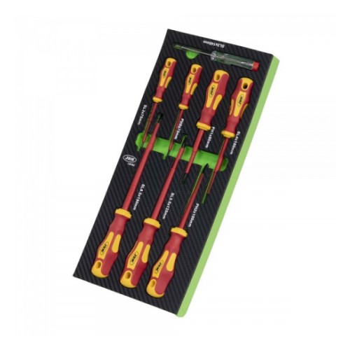 Pehmes PU-paneelis VDE 1000 V kruvikeerajate komplekt. Soovi korral saab kasutada tööriistakäru sahtlis. töölaua sahtlis. tööriistakotis või tööriistakohvris. Foam-paneeli mõõdud 175x380 mm. paksus 30 mm.