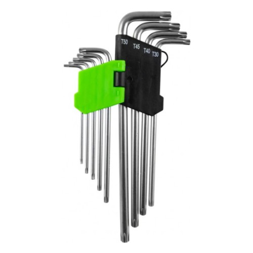 Pikkade L-Torx võtmete komplekt. avaga. 90-218 mm pikkused. Kroomvanaadium eriterasest. Plastikhoidikus. Komplekt sisaldab:L-Torx avaga T10-T15-T20-T25-T27-T30-T40-T45-T50