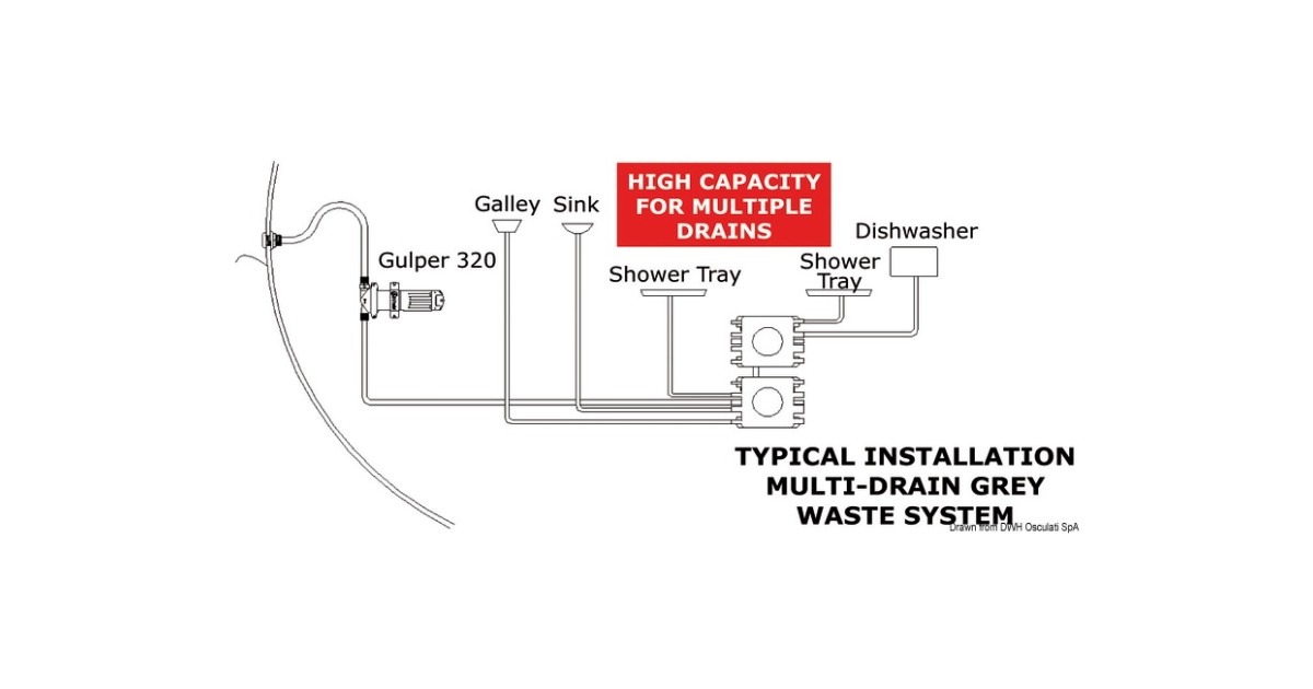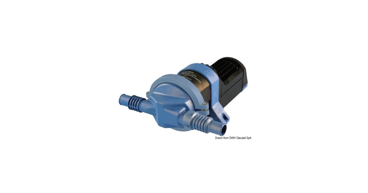 Designed to pump waste water, fitted with large single diaphragm, non-choke valves, quiet operation, no strainer required. Self-priming up to 3 metres. It can run dry and pump a mixture of air and water. Easy to install in confined spaces, dual outlet valve for an even flow. 360° adjustable inlets, low current draw. Patented Ezi-Clamp locking ring: head rotates 360° without loosing screws. 3-foot design for quick and easy installation. Anti-vibration rubber support belt. Power: 12 V, Capacity max: 19 l/min, Consumption: 7.5 A, Hose connector: 19/25 mm.