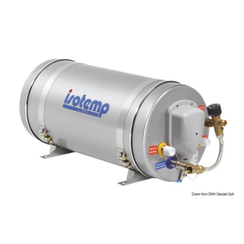 Isotemp boiler with internal tank, coil and stainless steel external cover. The tank has a 5-year warranty against leaks. Operation with 750 W 220 V nickel-plated copper resistance, or with heat exchanger connected to the engine cooling system. The resistance is positioned on the lower part of the b...
