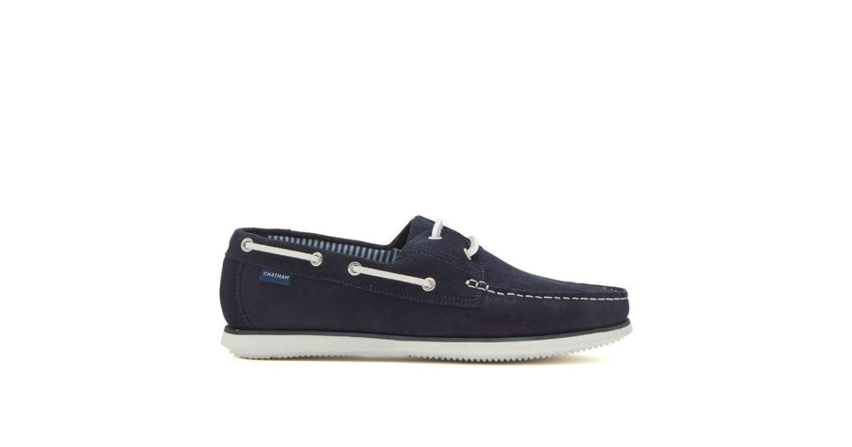 Cairns is a take on a classic boat shoe style crafted from premium suede with a stamped Chatham logo on the outer heel. This versatile grey colourway is matched with white leather laces, white stitching and a white sole. Cairns also features a striped lining as another nod to it's nautical styling.