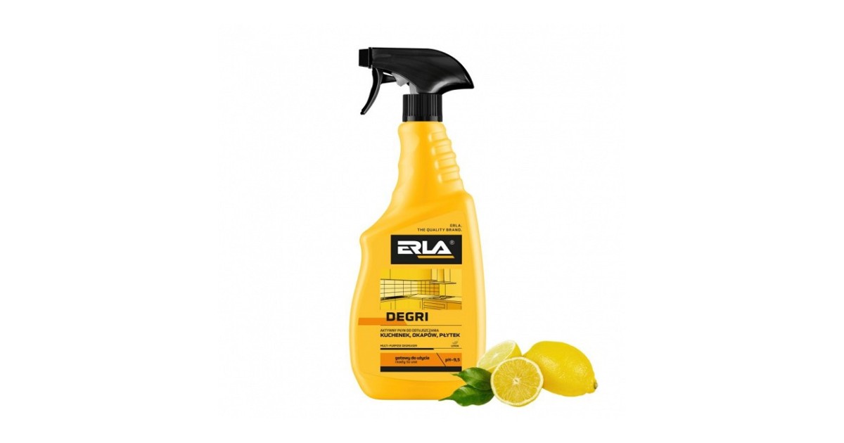 ERLA DEGRIi on professionaalne. kasutusvalmis universaalne köögirasva eemaldusvahend igapäevaseks kasutamiseks. Tänu toimeainetele lahustab rasvu. mistõttu aitab neid tõhusalt ja lihtsalt eemaldada ning samas on see puhastatud pindadele ohutu. Sellel on meeldiv sidruniaroom. mis kõrvaldab ebameeldivad lõhnad ja muudab lisaks igapäevase puhastustöö meeldivamaks. Eemaldab tõrksa mustuse. eemaldab kiiresti ja tõhusalt ilma triipudeta või plekkideta igasuguste rasvase ja õlise mustuse pindadelt. näiteks: topid. kubud. lauad. seinad. plaadid. mööbel. toitlustus- ja köögitehnika. sh induktsioon-. elektri- ja gaasipliidid. riided. Tänu regulaarsele ja sagedasele kasutamisele näevad puhastatud pinnad kauem välja nagu uued ja teenivad meid aastaid. Lisaks kaitseb see pindasid rooste eest. Erla Degri rasvaärastusvedelikku soovitatakse kasutada eelkõige hotellides. köökides. toiduainetööstuses ja toitlustustööstuses. Erla Degri rasvaeemaldusvahend on mõeldud eelkõige igapäevaseks professionaalseks kasutamiseks. kuid seda saab kasutada ka kodus.