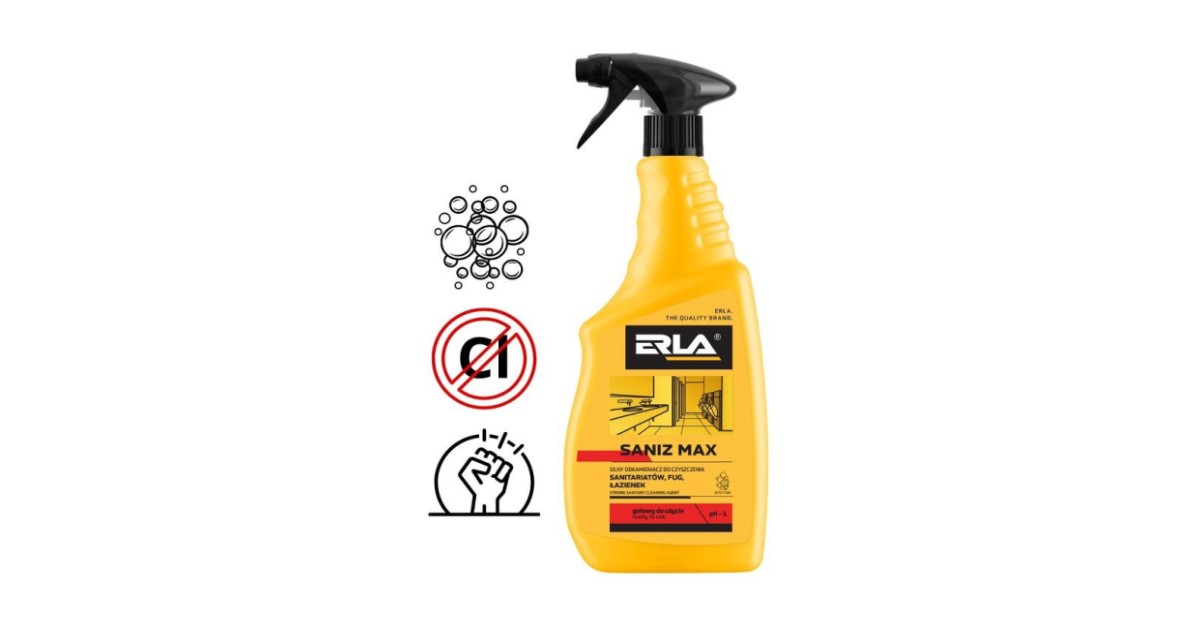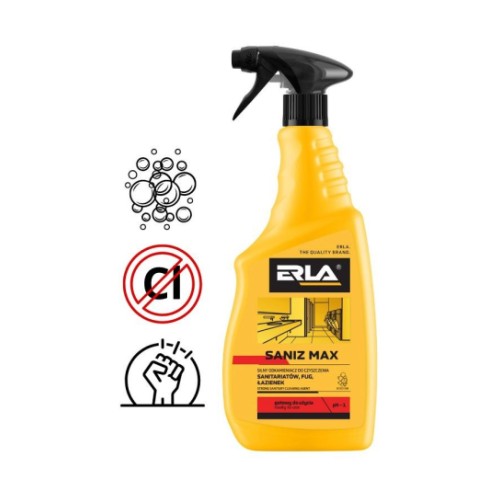 Erla Saniz Max on tugevatoimeline professionaalne vahend sanitaarruumide ja vannitubade puhastamiseks. eelkõige avalike ruumide. kontorite ja vannitubade põhjalikuks puhastamiseks. See happeline katlakivieemaldusvahend on mõeldud kasutamiseks peamiselt professionaalsetele puhastusettevõtetele. Sobib kasutamiseks kõikidel happekindlatel materjalidel ja pindadel. Eemaldab tõhusalt rooste. katlakivi. katlakivi ja seebijäägid. mida pole pikka aega puhastatud. Eriti soovitatav WC-pottide. pissuaaride. bideede. kraanikausside. vannide. dušialuste. dušikabiinide. roostevabast terasest elementide. kivikeraamika. põrandate. tsementvuukide. vuukide. plaatide ja vannitoatarvikute puhastamiseks. See kõrvaldab ebameeldiva uriinilõhna ja jätab pärast kasutamist värskendava efekti. ilma kloori ja valgendi lämmatava aroomita.