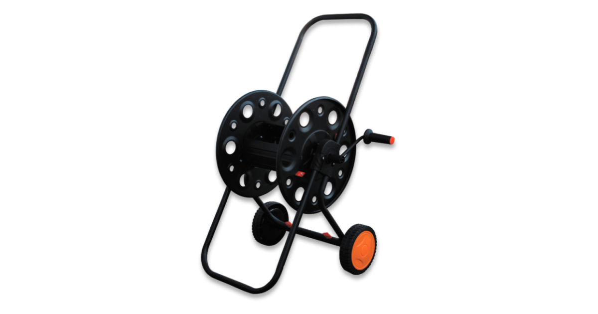 Hose reel cart DURAMET can store up to 1 0m of 1/2" hose. Made of metal. Equipped with stable and durable base. L ong handle makes it easier to move the reel without bending. Angled hose connection prevents hose from wrapping, kinking or twisting, while winding on and off.