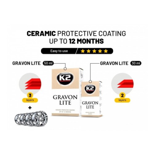 Keraamiline pinnakaitsevahend. mis kaitseb pinda kriimustuste. mustuse. UV-kiirguse ja muude väliste tegurite eest. Ühekordselt kattes annab kaitse 12 kuuks. kasutades kihtidena suureneb kaitse iga järgmise kihiga kuni 24 kuud. Keraamiline kate on suurepärane alternatiiv vahatamisele ning tänu suurepärastele mustust tõrjuvatele omadustele väheneb vajadus autot nii tihti pesta. Erinevalt vahadele ei ole keraamiline pinnakaitse maha pestav. ainus viis eemaldamiseks on masinpoleerimine. Keraamiline kate kaitseb ka grafitite eest. värv ei kleepu pinnale ja on kergesti eemaldatav. 50 ml on piisav u 3 kihi peale kandmiseks + velgede kaitseks (sõltuvalt auto suurusest). Komplekt sisaldab K2 Gravon Lite pinnakaitsevahendit. aplikaatorit ja 2 lappi.