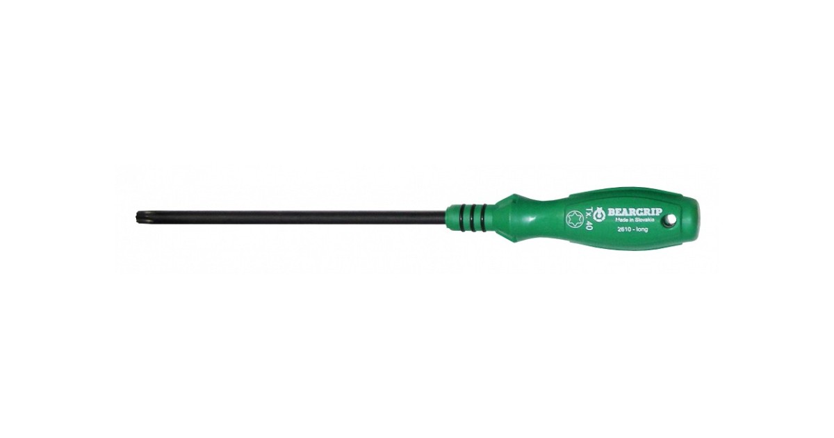Kõrgema kvaliteediklassi BEARGRIP kruvikeerajate metallosa on valmistatud kroom-molübdeen-vanaadium terasest. mis tagab ühelt poolt suure pinnakõvaduse. teisalt jällegi optimaalse väändetugevuse suurte jõumomentide ülekandmisel. 54-56 HRc. Käepideme valmistamiseks kasutatakse eriplasti. mis annab sellele kõrgendatud mehaanilise tugevuse ning õlide/kemikaalide-. UV kiirguse- ja temperatuurikindluse. Käepide on disainitud ergonoomilise kolmnurkprofiiliga. mis tagab parima haarde isegi ühekomponendilise käepideme puhul. Käepideme allosas on spetsiaalne kummirõngas. mis aitab kiirelt näppude vahel keerata pikka koostet enne või pärast tugevat pingutusmomenti. Käepide riputusavaga. Torx kruvikeeraja. pikk seeria 2610.