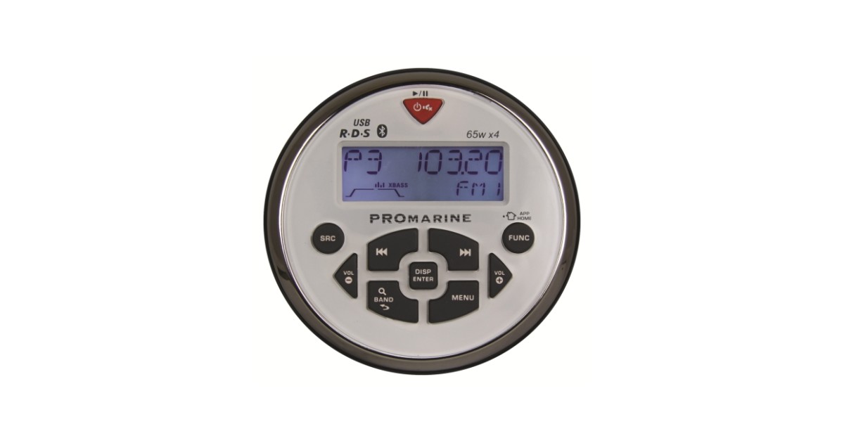 LTC Promarine Bluetooth Stereo in a round compact size and 100 % waterproof IP67. Fits nicely in with the other instrumentation in the boat. Available in black and white color, both with chrome outer ring. The stereo is at 4 x 65 W MOSFET amplifier. Stereo system has integrated Bluetooth for music streaming directly from your mobile phone (ideal for Spotify). RDS radio with 18 presets and built-in memory back-up so when the power is cut keeps your stereo left the radio memory. Two-row bright display, Low output, USB and AUX input (on the back) and an equalizer with four different settings, and separate bass and treble adjustment. Diameter: 91 mm. Also suitable for bathrooms, saunas and outdoor.