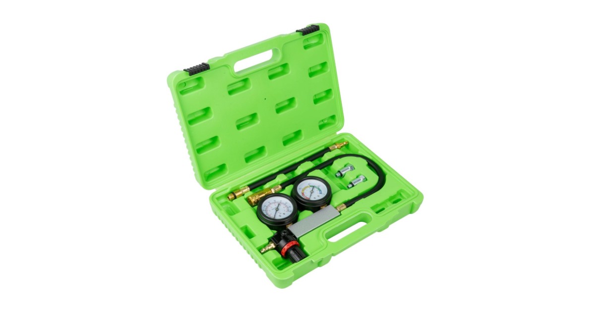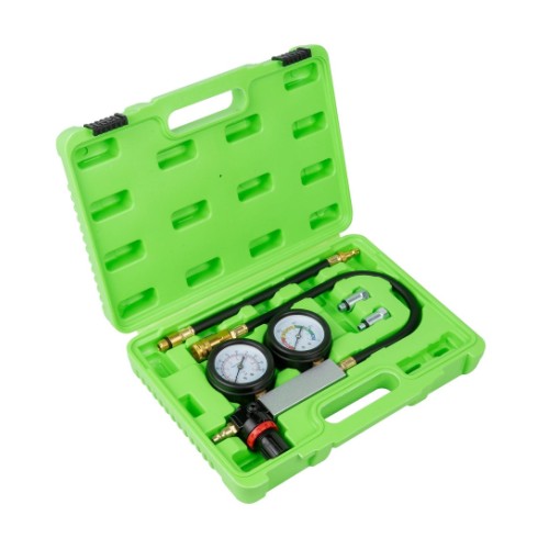 Lihtsalt kasutatav komplekt. mille abil saab tuvastada kolvigrupi või plokikaane defekte. Bensiinimootoritele. Tuvastab purunenud või kulunud kolvirõngad/kolvid/silindrihülsid. praod plokikaanes. klappide lekked või läbi laskva plokikaanetihendi. Töötab suruõhuga. millega ühendamiseks on kellapaneelil vastav adapter (suruõhu surve max 6.7 bar). Komplektis kaasas mõõtekellad. vahevoolik ja küünlaava adapterid mõõtudega M10x1.0. M12x1.25. M14x1.25. Plastkohvris.