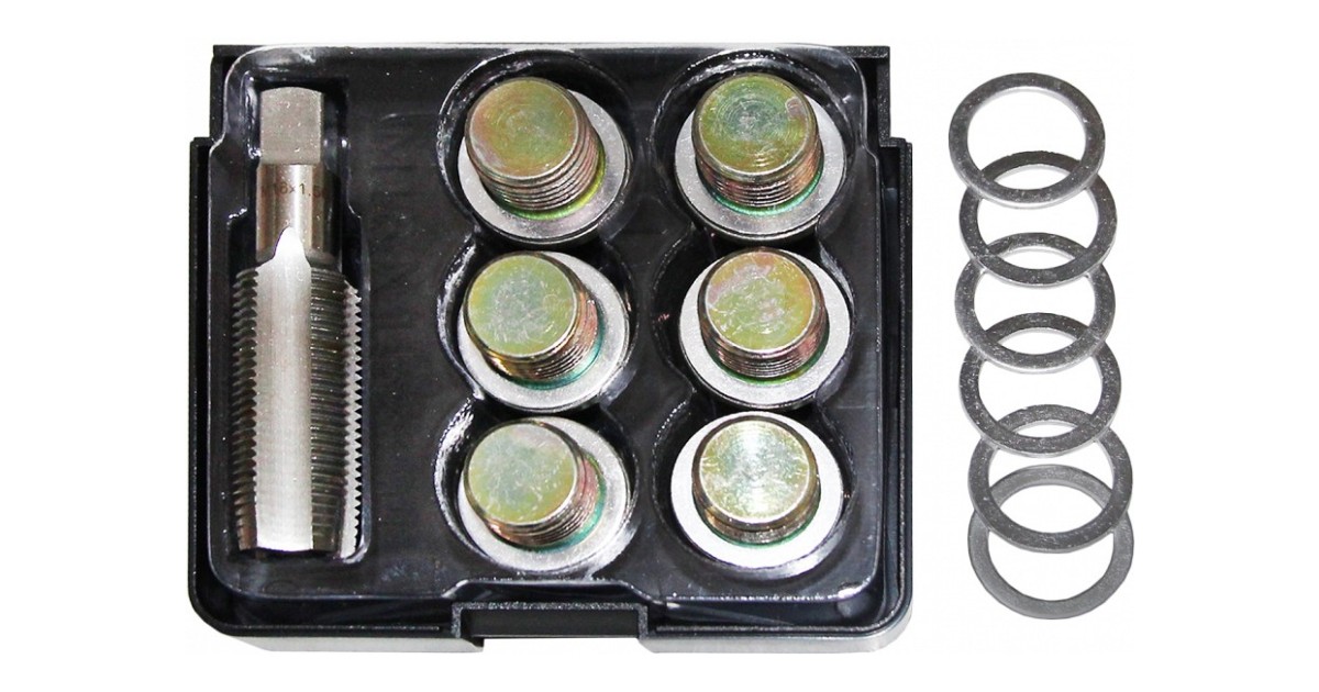 Komplekt sisaldab keermelõikurit. 6 õlikorki ja 6 tihendusseibi. Kasutatakse vigastatud õlikorgi keermega karterite remondil.