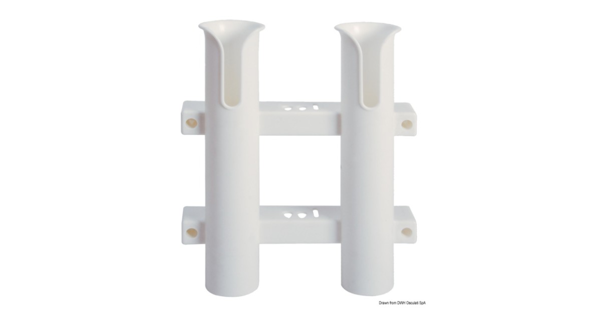 Wall-mounting plastic rod holder for two rods. Dimensions: 270 x 220 mm. Pipe hole: 44 mm.