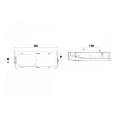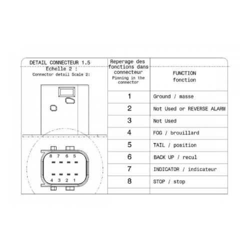 Tule küljel HDSCS 8 pin pistik. E-markeeritud. ADR. CCC. Laius 400 mm. kõrgus 160 mm. paksus 89.5 mm. kinnituspoltide vahe 160 mm. Valmistatud Prantsusmaal. Pirnid 3 x R5W. 4 x P21W ja 1 x PY21W. Sobib DAF HDSCS 8-pin pistik 999193090.