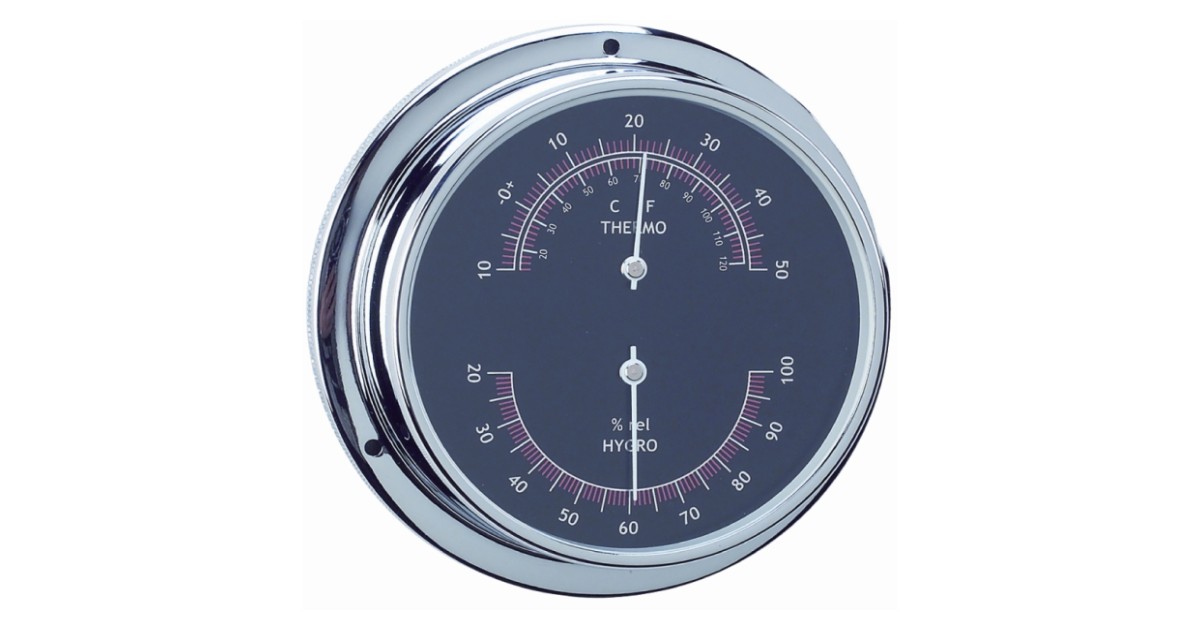 Polished lacquered brass housing thermometer-hygrometer from ANVI. Dimensions: 115 x 95 x 40 mm.