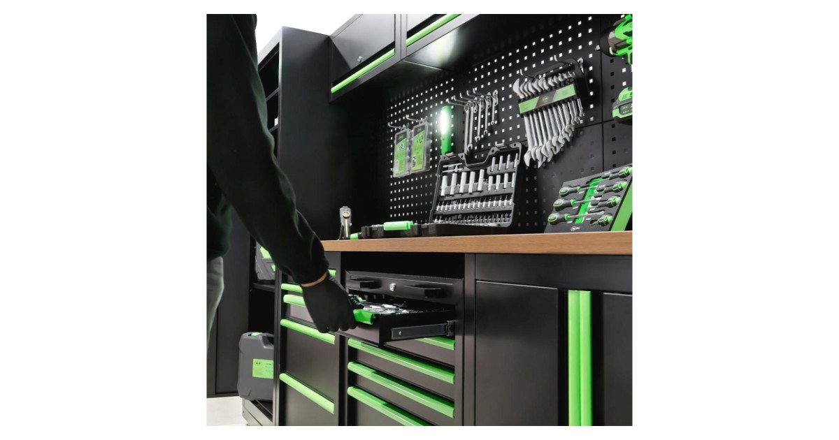 18 moodulist koosnev töölaud koos tööriistakäru (6-sahtlit. ratastega liigutatav auto juurde). lauasahtlite. riiulkapi. perfoseina ja ülakappidega. Kvaliteetne pulbervärvitud 0.8 mm paksune eriteras. Kõik sahtlid laagritega siinidel. Uksed-sahtlid lukustatavad. kapiuksed magnetsulguritega. MDF õli-...