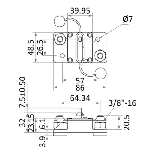 Watertight circuit breaker for winch, bow propeller, gangaway, trolling motors. Resettable, it can be released by means of a special lever. It is both a fuse and a switch. Made in compliance with the USA SAE J1171 / SAE J1625 standards. Voltage allowed: max 48 V, operating temperature: -32° + 92°. 3/8" electric terminals. Max load 50 A.