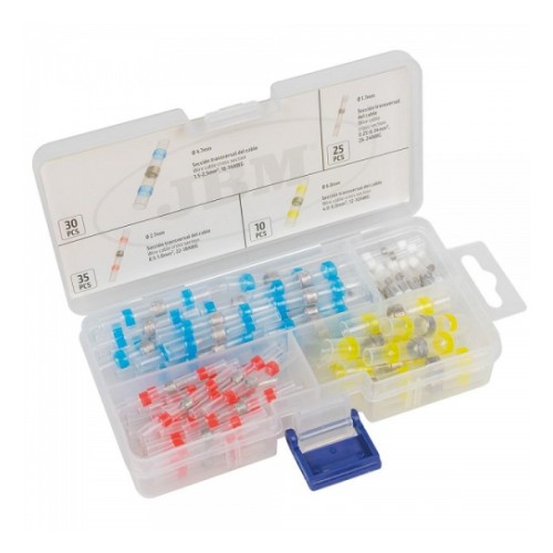 Termokahanevate jätkuliideste komplekt. Liides sisaldab tina koos nakkekeemiaga. ühendushülssi ja termokahanevat plastkatet. Värvid punane. sinine. valge. kollane. Hülsside läbimõõt 1.7-2.7-4.7-6.0 mm. Plastkarbis.