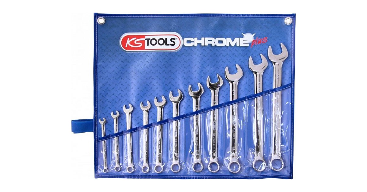 CHROMEplus silmus-lehtvõtmete komplekt. Tollmõõdud. Külgedelt haarav profiil (12-kant). Lehtvõtme kaldenurk 15°. Silmusvõtme osa painutatud 15°. Kroomitud ja poleeritud. Kroomvanaadiumteras.