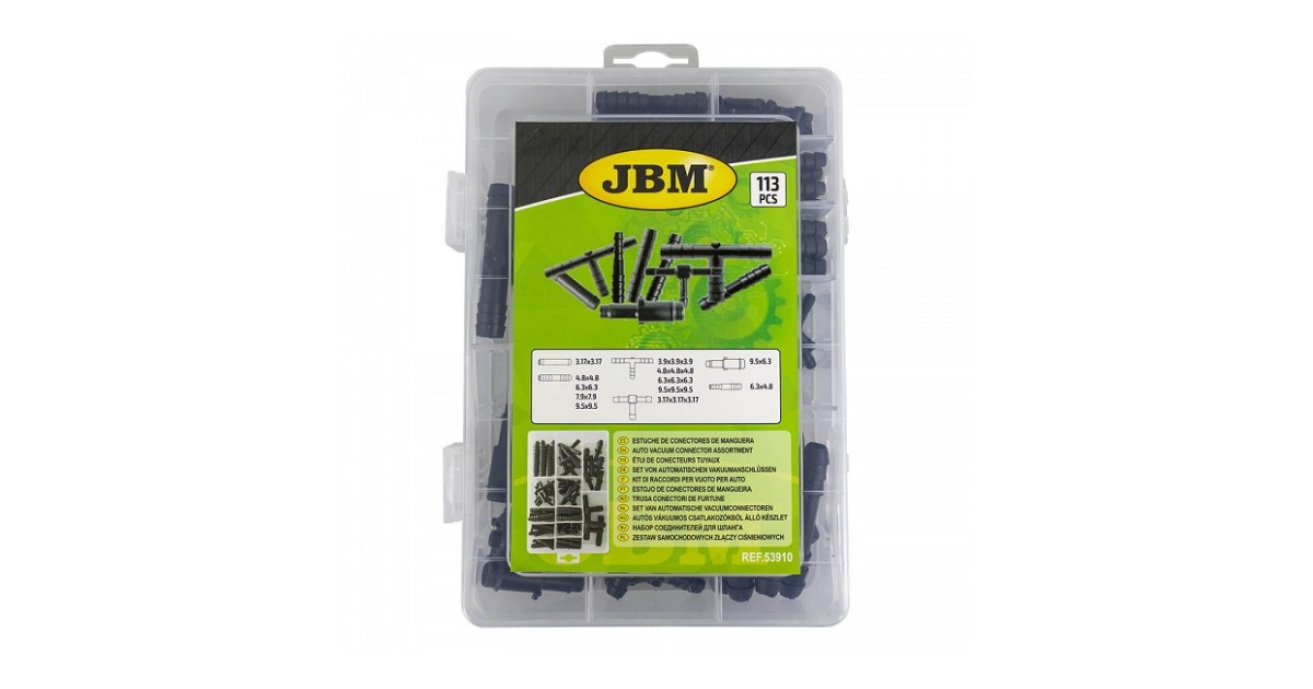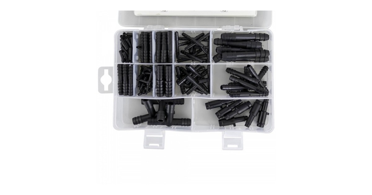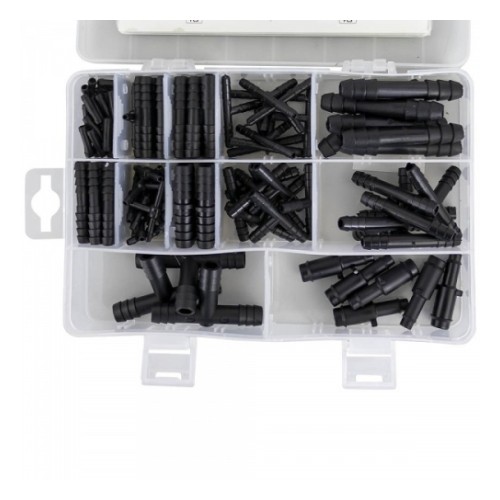 Komplekt. milles T ja I liidesed vaakomvoolikutele. klaasipesuri voolikutele jne. Samuti ülemineku liidesed suur-väike. 1/8"x 1/8" (3.17x3.17mm) sirge. 3/16"x 3/16" (4.8x4.8mm) sirge. 1/4"x 1/4" (6.3mmx6.3mm) sirge. 5/32"x5/32"x5/32" (3.9x3.9x3.9mm) T-jätk. 3/8"x 3/8" (9.5x9.5mm) sirge. 1/4"x 3/16" (6.3x4.8mm) üleminek. 1/8"x1/8"x1/8" (3.17x3.17x3.17mm) T-jätk. 5/16"x 5/16" (7.9x7.9mm) sirge. 3/16"x3/16"x3/16" (4.8x4.8x4.8mm) T-jätk. 1/4"x1/4"x1/4" (6.3x6.3x6.3mm) T-jätk. 3/8"x 3/8"x3/8" (9.5x9.5x9.5mm) T-jätk. 3/8"x 1/4" (9.5x6.3mm) üleminek.