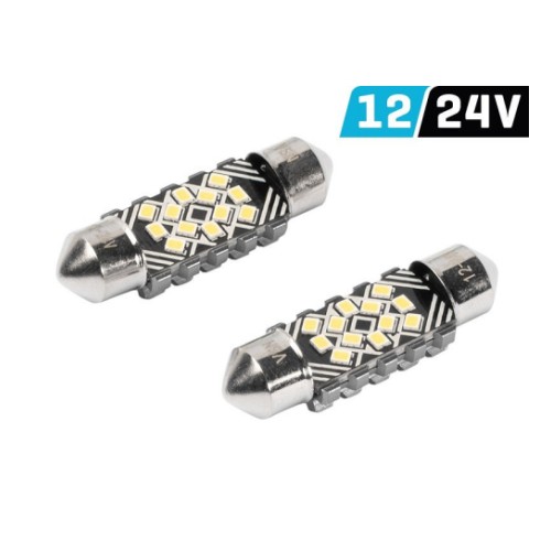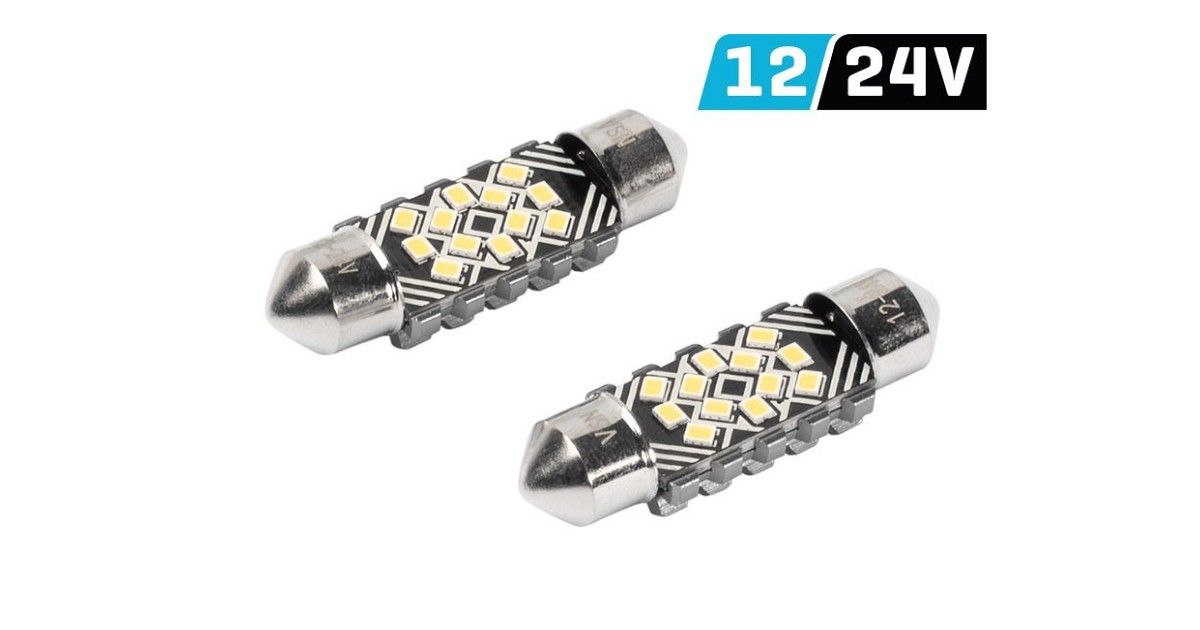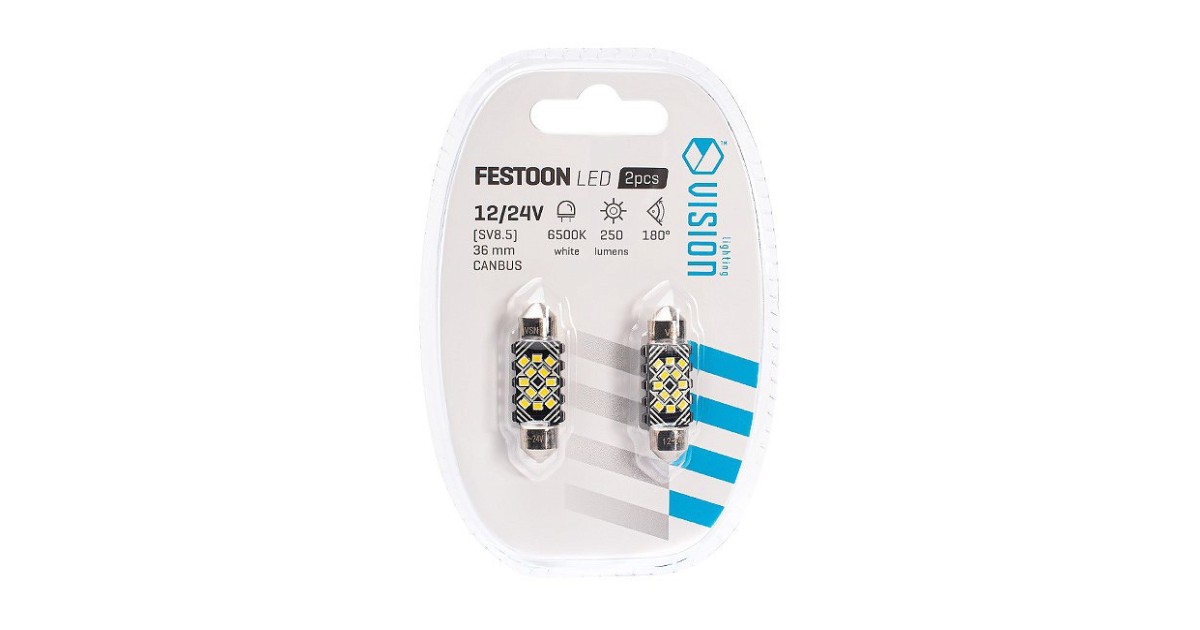 Tehniline info:Sokkel SV8.5-8 C5W 36 mm LEDi tüüp 12x2016 SMDVärvus valgeVõimsus 2.4 WValgusefektiivsus 250 lmValgustemperatuur 6500 K Pinge 12/24 VCANBUS veateate eemaldaja