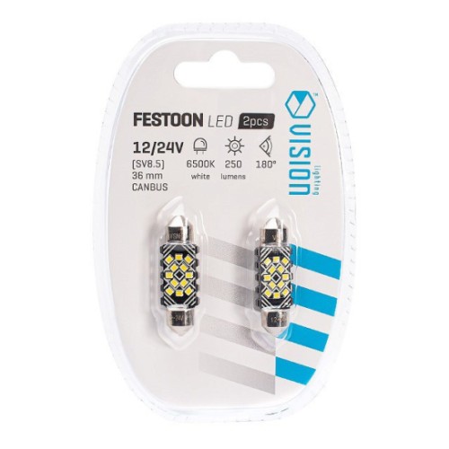 12/24V Sv8.5-8 Festoon Led Pirn 2.4W 36Mm 6500K Canbus Valge Blister 2Tk Vision