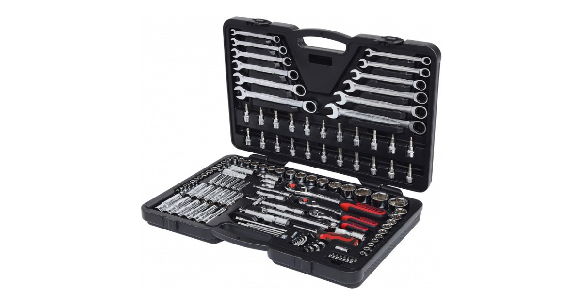 Premium tööriistakomplekt. mis sisaldab kõiki enamvajaminevaid padruneid. tirrmehhanismiga silmus-lehtvõtmeid. otsikuid. L-kuuskant võtmeid jne. Padrunid 6-kant profiiliga. CHROMEplus pinnatöötlus.
