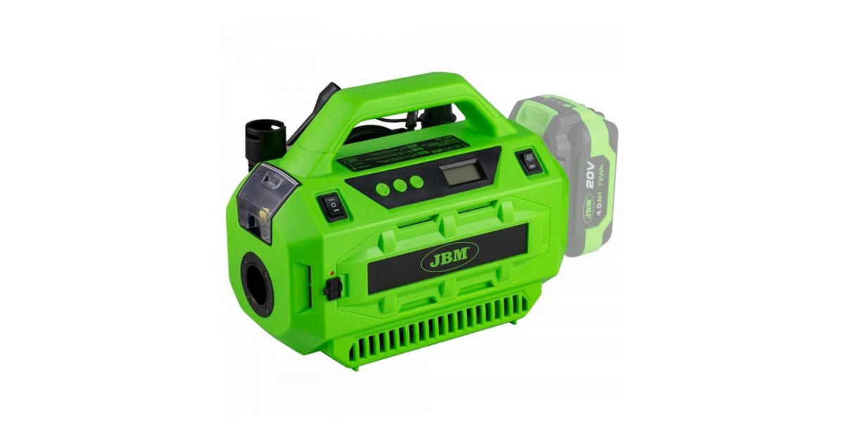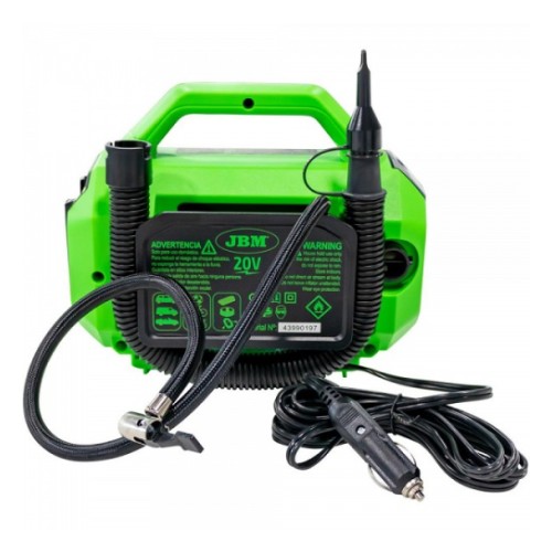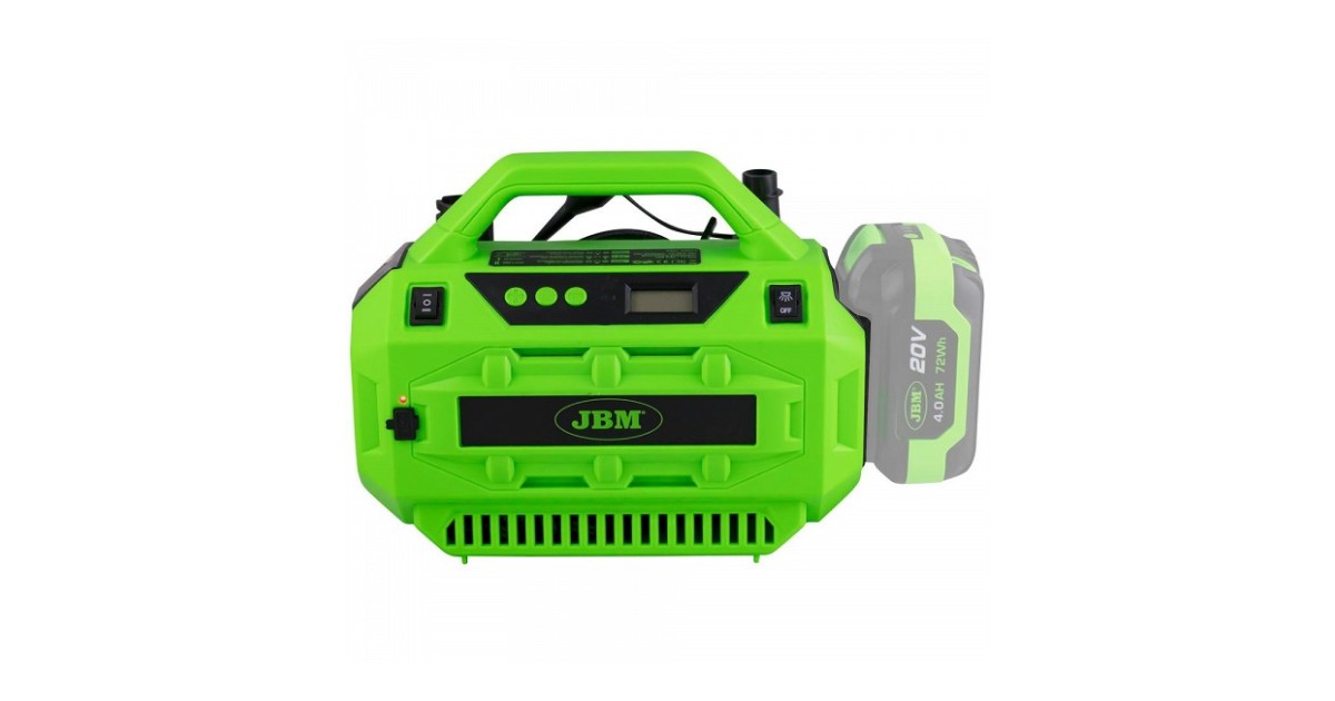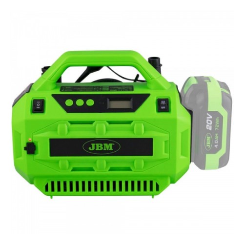 Universaalne kompressor. mis töötab 12 V auto elektrisüsteemilt või siis 20 V JBM akutööriistade akult. LED valgustiga. Kaks tööreziimi 12 l/min ja hüper 380 l/min. Kaasas 76 cm pikkune pumpamisvoolik. millega kaasas kõik enamlevinud ventiiliotsikud. Samuti palli pumpamise otsik. Lisaks on kompressoril kaasas suure tootlikkusega pumpamistoru nt madratsite või paatide pumpamiseks. LCD-displei. Aku ja laadijata mudel. Garantii 12 kuud.