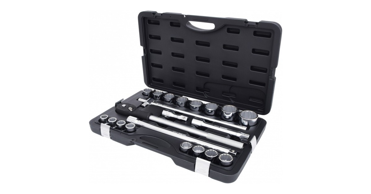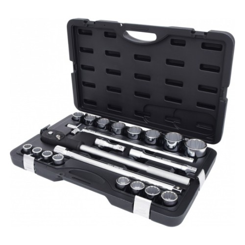 12-kant profiiliga padrunite komplekt. Plastkohvris.Komplekt sisaldab:3/4" padrun 19-21-22-23-24-26-27-29-30-32-35-36-38-41-46-50 mm3/4" pikendused 100-200-400 mm3/4" T-saba 450 mm3/4" tirrvõti 24H. padrunilukustusega