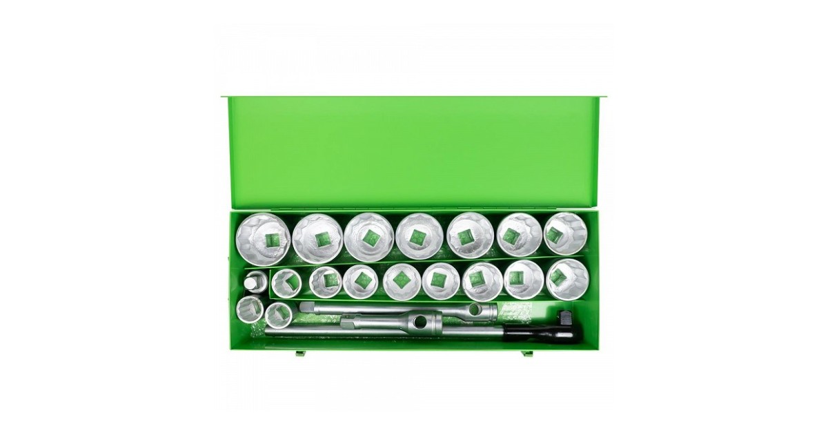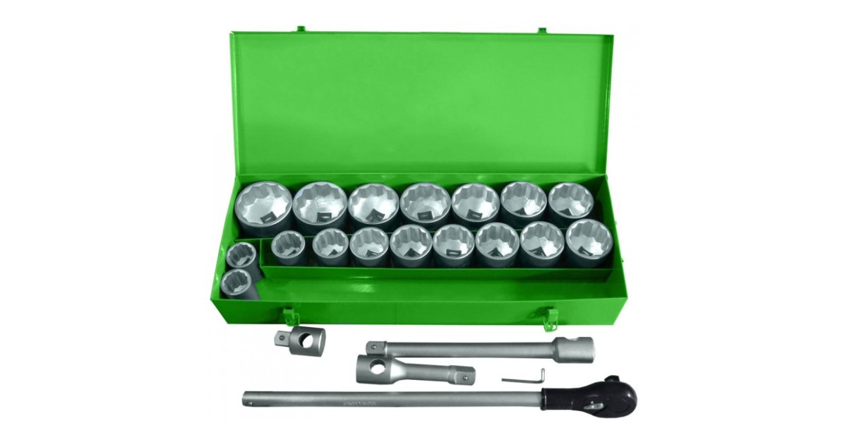Metallkohvris padrunite komplekt. 12-kant profiiliga padrunid. Komplektis korralik tirrvõti. pikendus ja T-saba moodustamise adapter.Komplekt sisaldab:1" tirrvõti 650 mm1" pikendus 405 mm1" pikendus keeramissaba moodustamise avaga. 205 mm1" adapter keeramissaba moodustamiseks1" padrun 36-38-41-46-50...