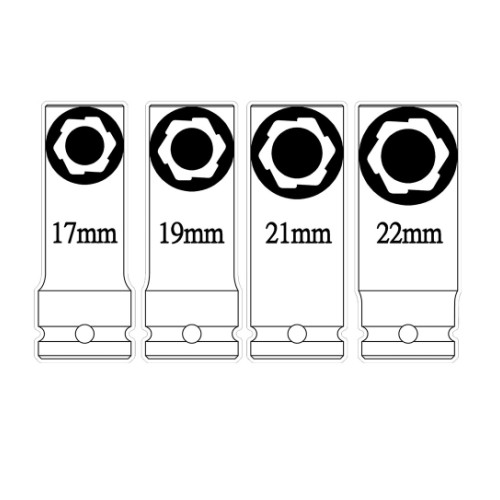 Suurepärane komplekt autoremondi- ja rehvitöökodadele. Komplektis olevad padrunid omavad spiraalhammastust. mille abil on võimalik lahti keerata ülekeeratud poldid/mutrid. Samuti soovitame kasutada komplekti juhtudel. kui poldi/mutri pea on kulunud ning on ülekeeramise oht. Padrunid sobivad kasutamiseks mõõtudele 17-19-21-22 mm ehk enamlevinud rattamutrite/poltide mõõdud (k.a Aasia autod). Padrunid on valmistatud spetsiaalsest kroommolübdeen sulamist. Fosfaaditud pinnatöötlus. Plastkarbis.