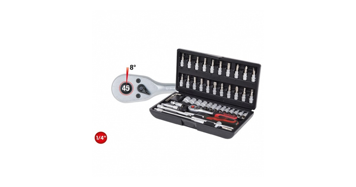 Madala profiiliga padrunvõtmete komplekt. 6-kant profiiliga padrunid. matt pinnaviimistlus. Plastkohvris.Komplekt sisaldab:1/4" tirrvõti 72H. padrunilukustusega1/4" pikendused 50-100-150 mm1/4" T-saba1/4" kruvitskäepide 150 mm. 1/4" adapterotsaga käepidemeosal1/4" kardaan1/4" adapterotsik1/4" lühike...