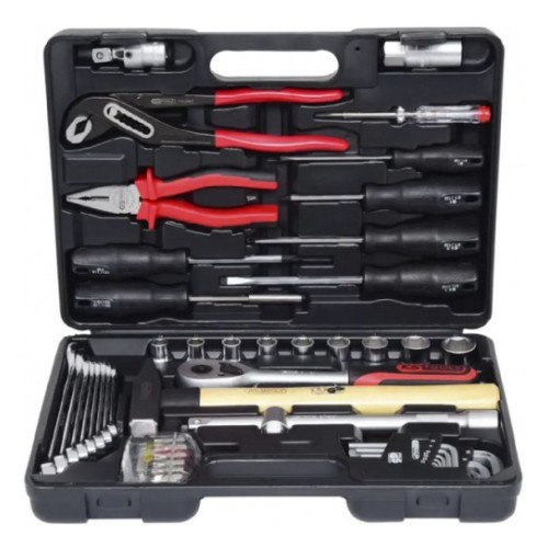 Ideaalne kodukasutusse. Sisaldab enamlevinud padruneid. silmus-lehtvõtmeid. otsikuid. kruvikeerajaid. näpitsaid ja vasarat. Siidmatt pinnatöötlus. Tugev plastkohver. metallist lukustitega.