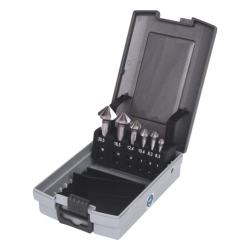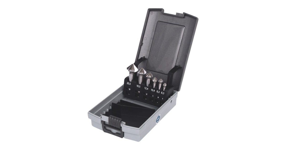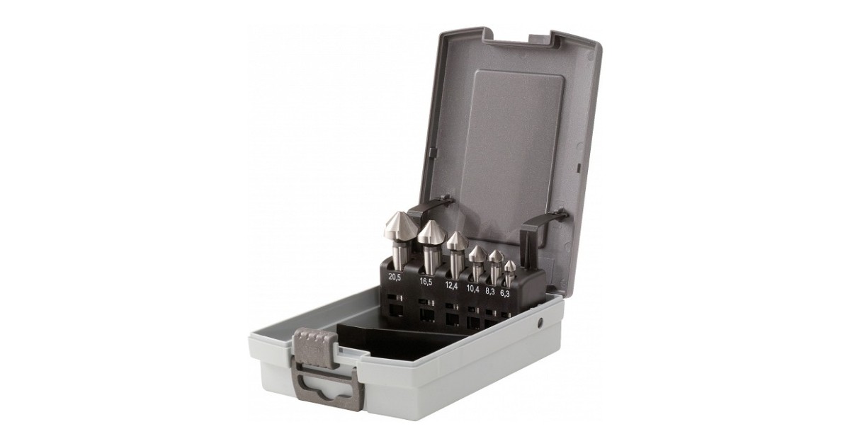 Faasiava lõikur. Lõikenurk 90°. HSS kiirlõiketeras. DIN. Plastkarbis.Komplekt sisaldab:Faasiava lõikur 6.3-8.3-10.4-12.4-16.5-20.5 mm