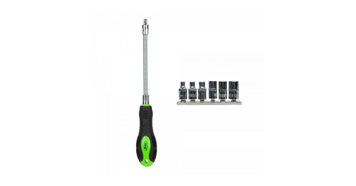 Painduva kaelaosaga kruvikeeraja. millel otsas 1/4" padrunite adapterotsik. Komplektis padrunid 4-5-6-7-8-10 mm. Kasutatakse raskesti ligipääsetavates kohtades. nt voolikuklambrite lahti keeramiseks.