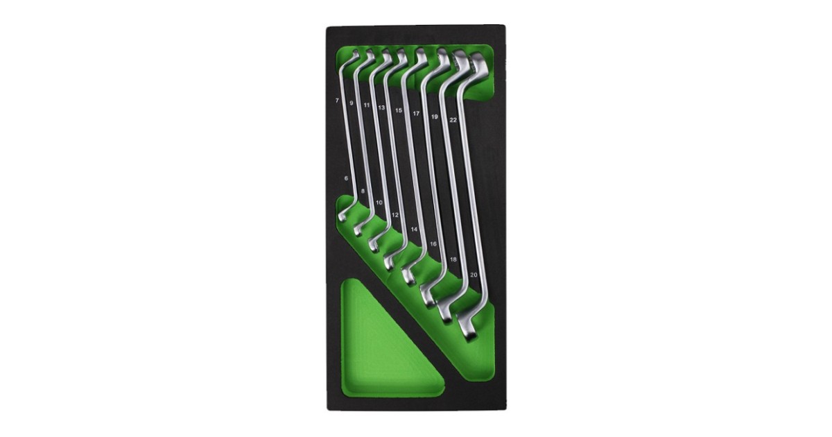 Pehmes PU-paneelis silmus-silmusvõtmete komplekt. Soovi korral saab kasutada tööriistakäru sahtlis. töölaua sahtlis. tööriistakotis või tööriistakohvris. Foam-paneeli mõõdud 175x380 mm. paksus 30 mm.