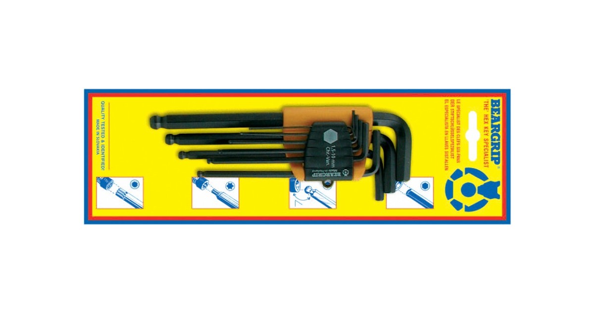 Kuulotsaga L-kuuskantvõtmed. võimalik poldipead keerata nurga all. Valmistatud CrV eriterasest. fosfaaditud pinnatöötlus. Plasthoidikus. Valmistatud Slovakkias.