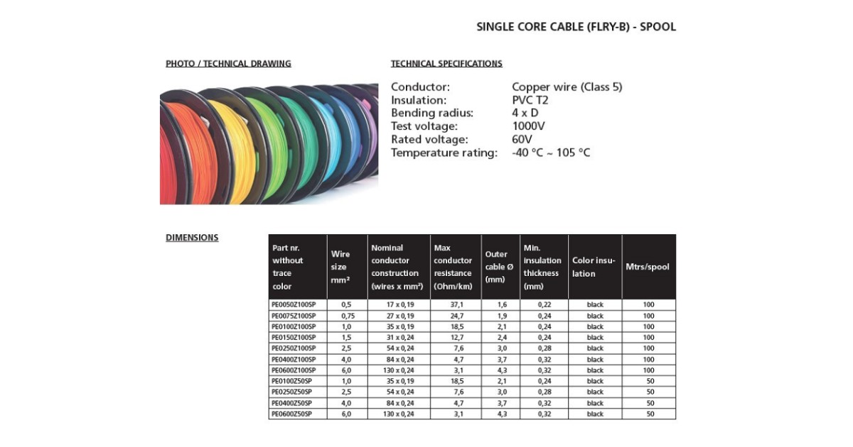 Vähendatud isolatsioonipaksusega ühesooneline elektrijuhe. mida kasutatakse mootorsõidukite madalpinge paigaldustes. Materjal: vask klass 5 (juht). PVC T2 (isolatsioon). Ei sisalda kroomi (VI). kaadmiumi. pliid ega elavhõbedat. Painderaadius 4xD. Testpinge 1000V. nimipinge 60V. Kasutustemperatuur -4...