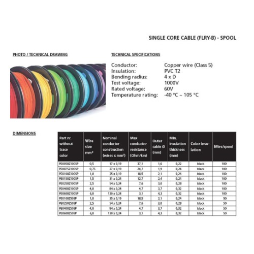 Vähendatud isolatsioonipaksusega ühesooneline elektrijuhe. mida kasutatakse mootorsõidukite madalpinge paigaldustes. Materjal: vask klass 5 (juht). PVC T2 (isolatsioon). Ei sisalda kroomi (VI). kaadmiumi. pliid ega elavhõbedat. Painderaadius 4xD. Testpinge 1000V. nimipinge 60V. Kasutustemperatuur -4...