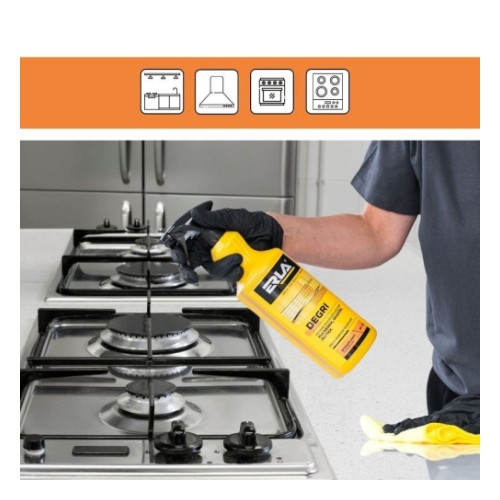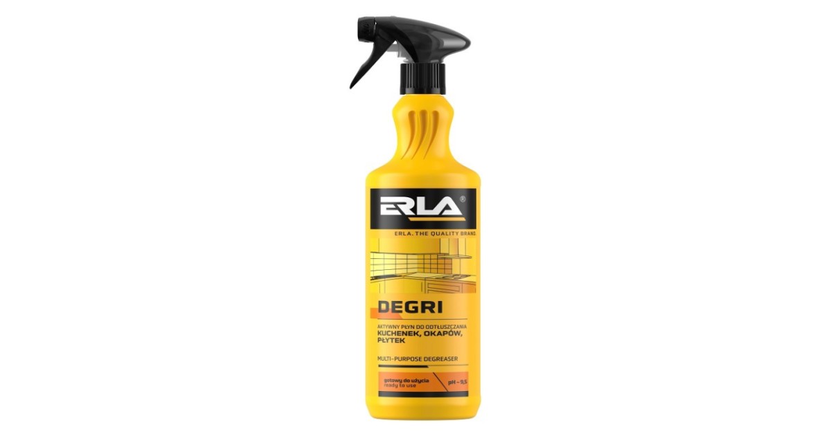 ERLA DEGRIi on professionaalne. kasutusvalmis universaalne köögirasva eemaldusvahend igapäevaseks kasutamiseks. Tänu toimeainetele lahustab rasvu. mistõttu aitab neid tõhusalt ja lihtsalt eemaldada ning samas on see puhastatud pindadele ohutu. Meeldiva sidruniaroomiga. Eemaldab tõrksa mustuse kiires...