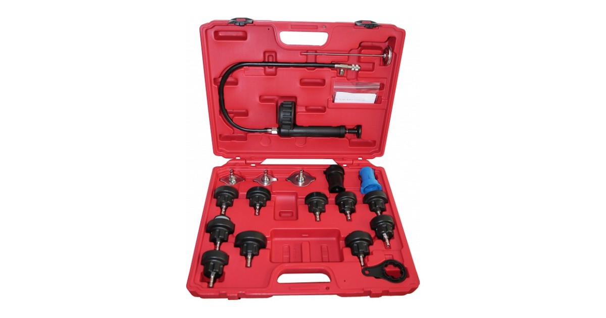 Universaalne komplekt testimaks enamike sõiduautode jahutussüsteemide survepidavust. vana jahutusvedeliku süsteemist täielikuks väljastamiseks ja ka õhukorkide eemaldamiseks süsteemist. Komplektis käsipump manomeetriga 0-2.5 bar. Adapterid enamikele Euroopa. Jaapani. Korea ja ka mõningate Ameerika autode jahutussüsteemidele. Komplektis sisalduv universaalne temperatuuriandur 0-200ºC võimaldab teostada testimist määratud temperatuuride juures.
