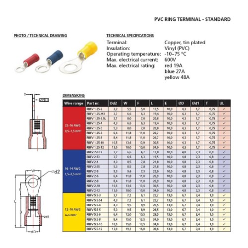 Erakordse isolatsioonivõimega kuuma- ja külmakindlad juhtmeotsikud. Läbimõõt Ø 6.4 mm. juhtmele 0.5-1.5 mm² (22-16 AWG). Materjal: PVC (isolatsioon). elektrotinaga kaetud vask (juhtmeotsik). Kasutustemperatuur -10°C kuni +75°C. Max pinge 600V. max voolutugevus 19A. Pakis 10 tk.