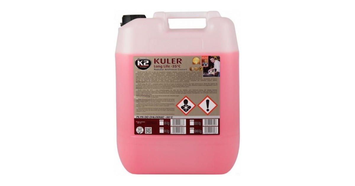 K2 KULER -35°C on kaasaegne. kuid universaalne. kasutusvalmis radiaatorivedelik. mida iseloomustavad väga kõrge jõudlusega parameetrid. mis on pärjatud Brüsseli. Genfi ja Souli rahvusvahelisel leiutismessil kuldmedalidega. Spetsiaalselt välja töötatud segu kaitseb suvel mootorit ülekuumenemise ja talvel külmumise eest. Suurepärane karboksüülhapetest koosnev inhibiitorpakett. millele on lisatud spetsiaalseid korrosiooniinhibiitoreid ja vahutamisvastaseid aineid. kaitseb mootorit ja tagab mootori täieliku kaitse 5 aastaks või 250 000 kilomeetriks. ka siis. kui segame seda teiste pikaealiste jahutusvedelikega. K2 KULER -35°C Võib kasutada igat tüüpi radiaatorites. eriti alumiiniumradiaatorites ja segada teiste sama kvaliteetsete jahutusvedelikega. olenemata värvist. K2 KULER -35°C vastab rangetele Ameerika standarditele ASTM D 3306 ja ASTM D 2570. Vedeliku kõrgeimat kvaliteeti kinnitavad Air Force Institute of Technology testid vastavalt PN-C-40007.