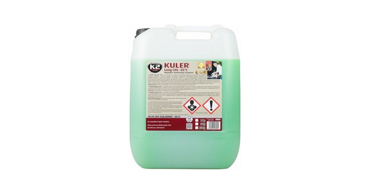 K2 KULER -35°C on kaasaegne. kuid universaalne. kasutusvalmis radiaatorivedelik. mida iseloomustavad väga kõrge jõudlusega parameetrid. mis on pärjatud Brüsseli. Genfi ja Souli rahvusvahelisel leiutismessil kuldmedalidega. Spetsiaalselt välja töötatud segu kaitseb suvel mootorit ülekuumenemise ja talvel külmumise eest. Suurepärane karboksüülhapetest koosnev inhibiitorpakett. millele on lisatud spetsiaalseid korrosiooniinhibiitoreid ja vahutamisvastaseid aineid. kaitseb mootorit ja tagab mootori täieliku kaitse 5 aastaks või 250 000 kilomeetriks. ka siis. kui segame seda teiste pikaealiste jahutusvedelikega. K2 KULER -35°C Võib kasutada igat tüüpi radiaatorites. eriti alumiiniumradiaatorites ja segada teiste sama kvaliteetsete jahutusvedelikega. olenemata värvist. K2 KULER -35°C vastab rangetele Ameerika standarditele ASTM D 3306 ja ASTM D 2570. Vedeliku kõrgeimat kvaliteeti kinnitavad Air Force Institute of Technology testid vastavalt PN-C-40007.