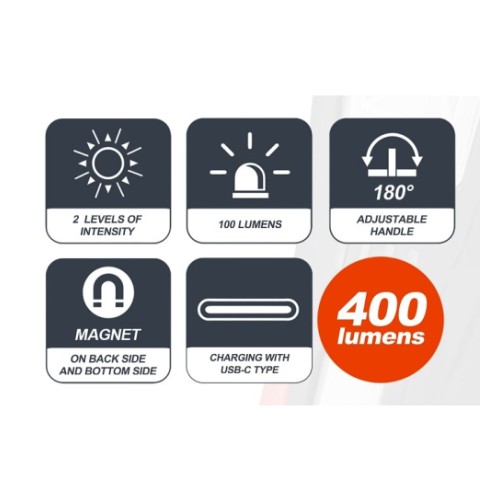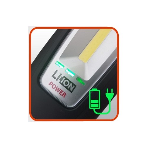 Li-Ion COB LED võimas töölamp Triumf MIDI. Uuemat tüüpi USB-C pesa kaudu laadimine (DV 5 V. 1 A). Lambi otsal on täpne kohtvalgusti 100 lm. põlemisaeg 10 tundi. Võimas külgvalgusti. 2 asendiga: 400 lm. põlemisaeg 3.5 tundi ja 250 lm. põlemisaeg 5 tundi. Aku Li-Ion 3.7 V. 2600 mAh. 9.62 Wh. Väga tugev magnet korpuse all ja taga. 180 kraadi nurga ulatuses reguleeritav/fikseeritav korpus. Riputuskonks 360° pööratav. Kaitseklass: IP65. IK07. Löögikindlast plastist korpus. Aku laetuse indikaatoriga. USB laadija kaabel sisaldub komplektis.