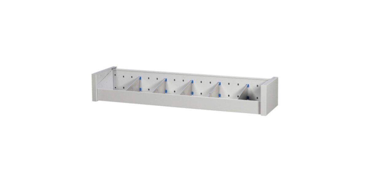 Eraldavate vaheseintega riiul. Tootekoodi lõpp näitab ära lahtrite arvu. Võimalik kinnitada otse moodulitele. Pulbervärvitud teras.Toote andmed:Pikkus 1014 mmSügavus 260 mmKõrgus 165 mmLahtreid 6Kaal 5.0 kg