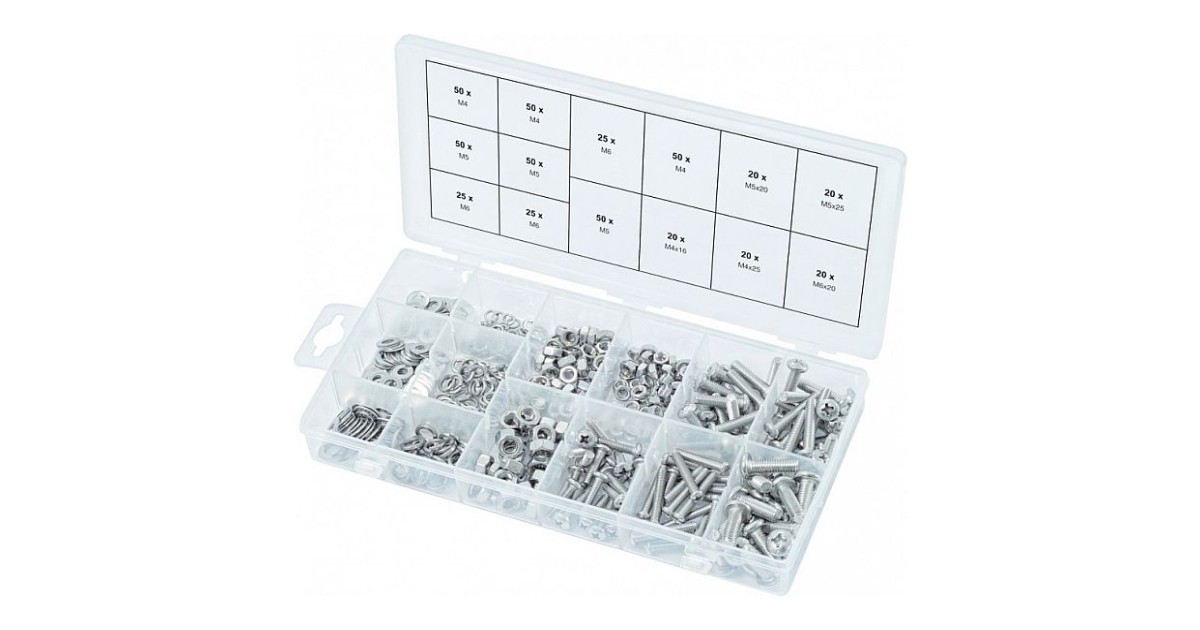 Kruvi: 20 x M4x16.0 mm. 20 x M4x25.0 mm. 20 x M5x20.0 mm. 20 x M5X25 mm. 20 x M6x20 mmSeib: 50 x M4. 50 x M5. 25 x M6Vedruseib: 50 x M4. 50 x M5. 25 x M6 Mutter: 50 x M4. 50 x M5. 25 x M6
