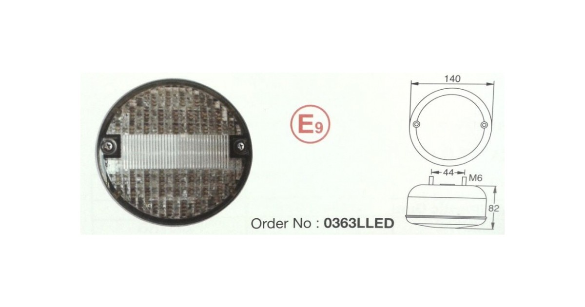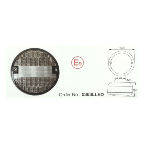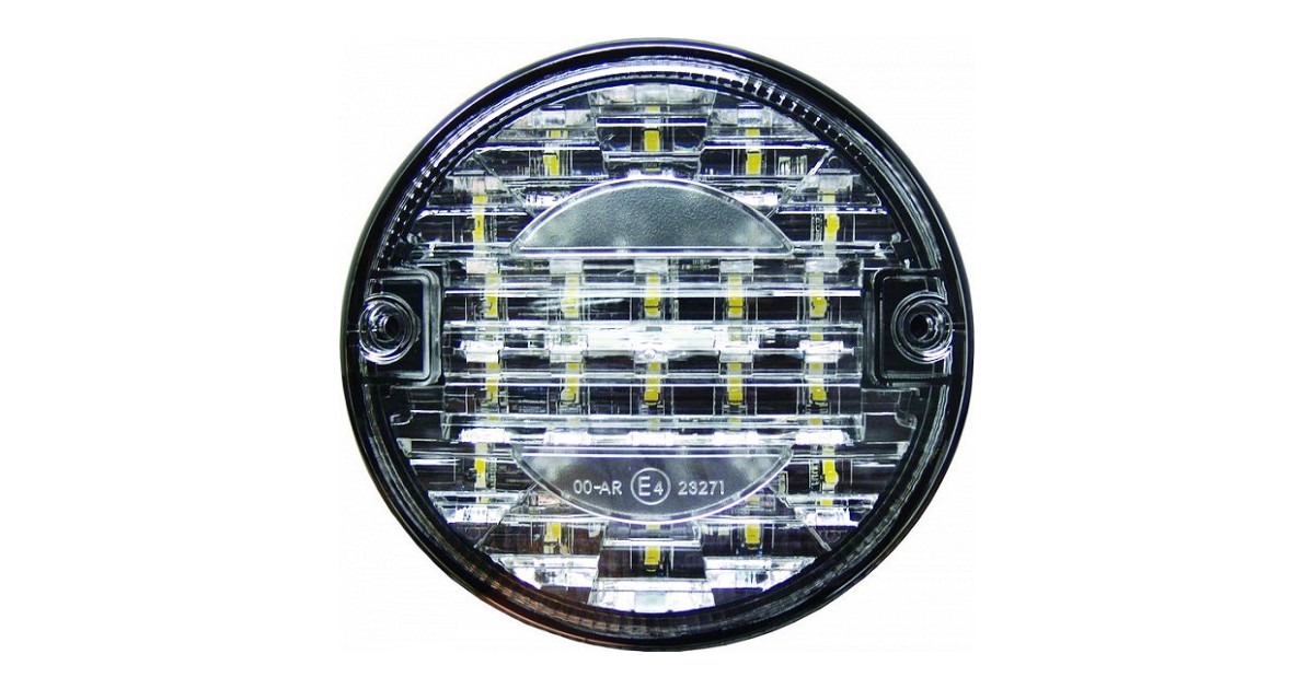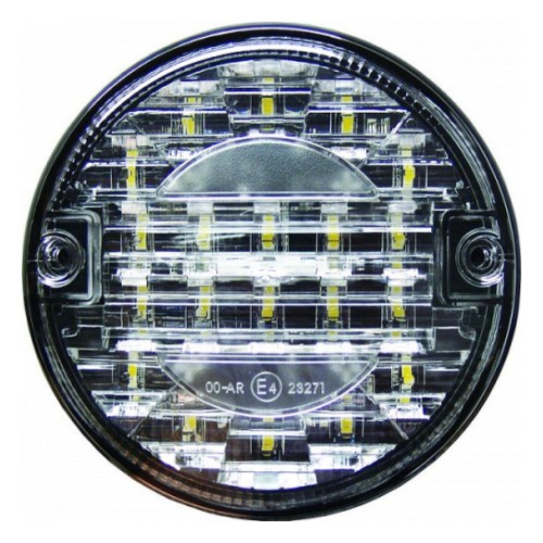 Ümmargune tagatuli. Valge klaasiga. Sobib nt tagurdustuleks. 24 V elektrisüsteemidele. E-markeeritud. Läbimõõt 140 mm. paksus 82 mm. kinnituspoltide vahe 45 mm.