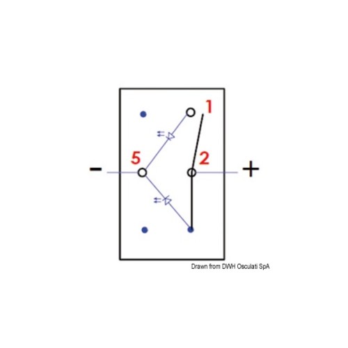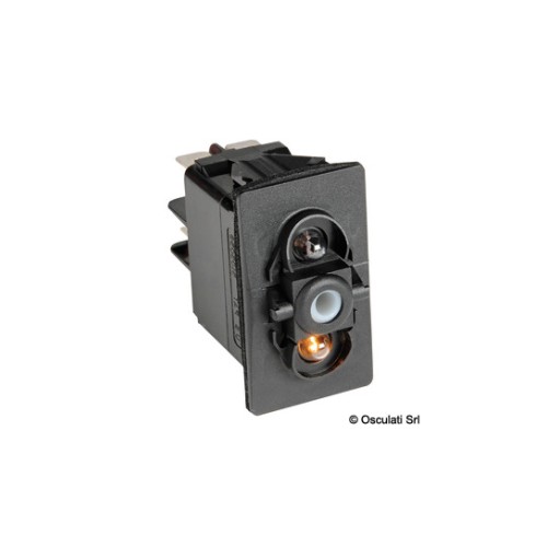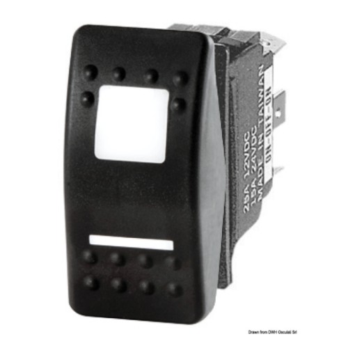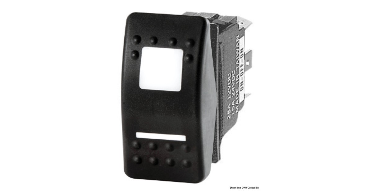 IP56 veekindel lüliti, Marina seeria. Paigaldamiseks on vaja 21,5 x 36,8 mm ristkülikukujulist ava. Maksimaalne võimsus 20 A 12 V juures ja 12 A 24 V juures. Komplektis kahe punase LED-iga: üks sümboli jaoks, mis on alati sisse lülitatud, teine sümboli all oleva spetsiaalse ava jaoks, mis lülitub sisse, kui sümboli indikaator aktiveeritakse. Külgklapp lüliti tuleb tellida eraldi.