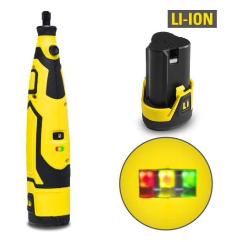Laia kasutusvõimalusega - puuri. lihvi. käia. freesi! Komplekt sisaldab erinevaid tarvikuid. tsange. 2Ah aku ja laadija.Tehniline info:Aku tüüp Li-ion 12 V7 kiirust 5000-25000 p/minMüra 78 dB